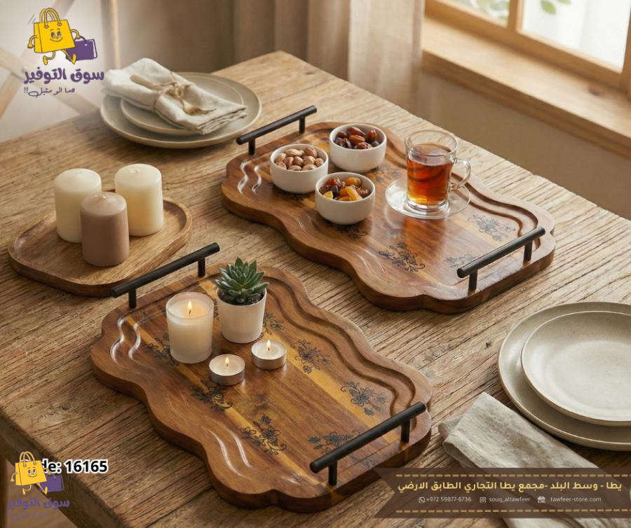 طقم صواني ضيافة خشب مشرف قطعتين منقش اسود يدين معدن اسود YP20242