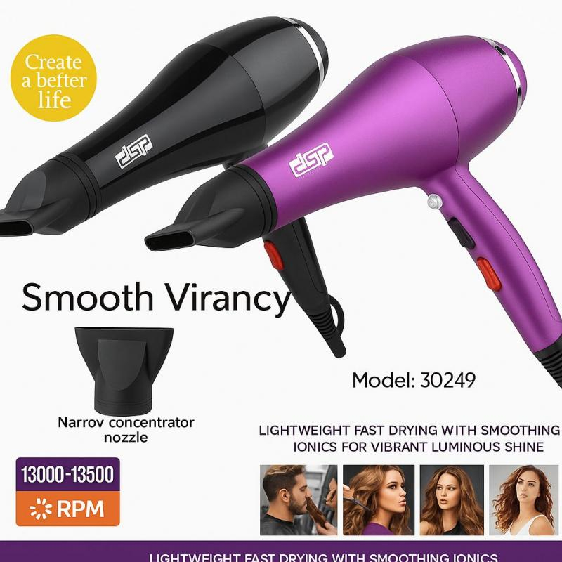 قدرة عالية: محرك قوي يمنح تدفق هواء فعّال لتجفيف أسرع وتصفيف مثالي.